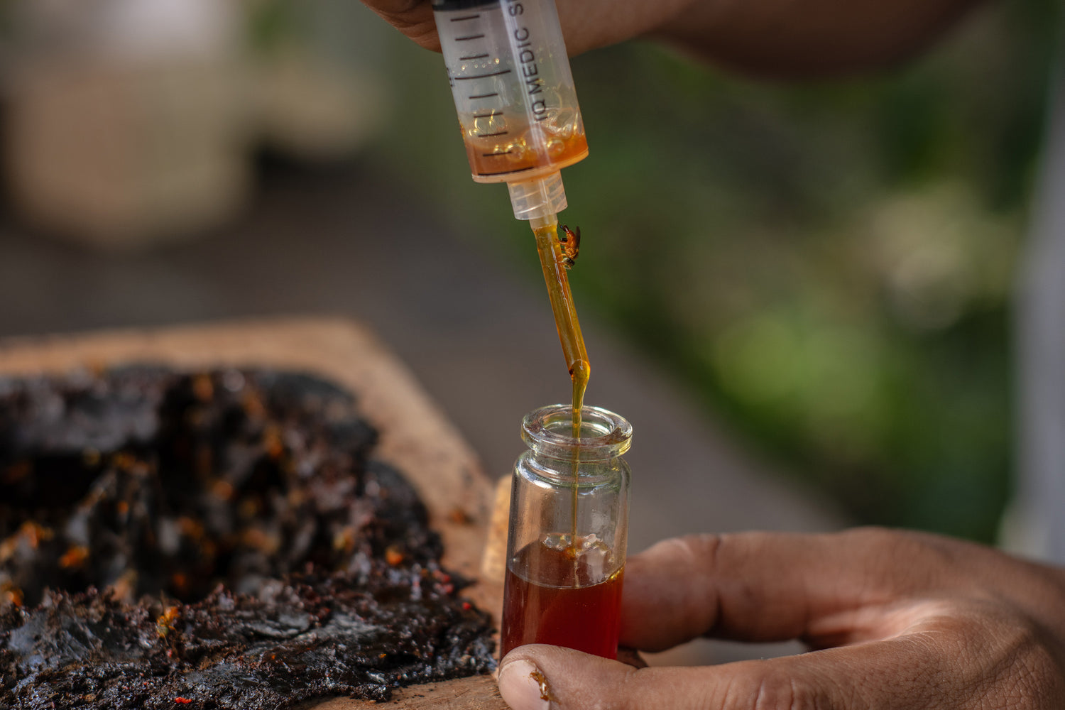 プロポリス由来のポリフェノールが加わったハリナシバチのはちみつは、黒くて甘酸っぱい味わい。一般的なはちみつよりも糖度が低いので甘さも控えめ。巣から直接ストローで飲めるほどサラサラとしていて結晶化しにくく、吸収されやすいのが特徴です。