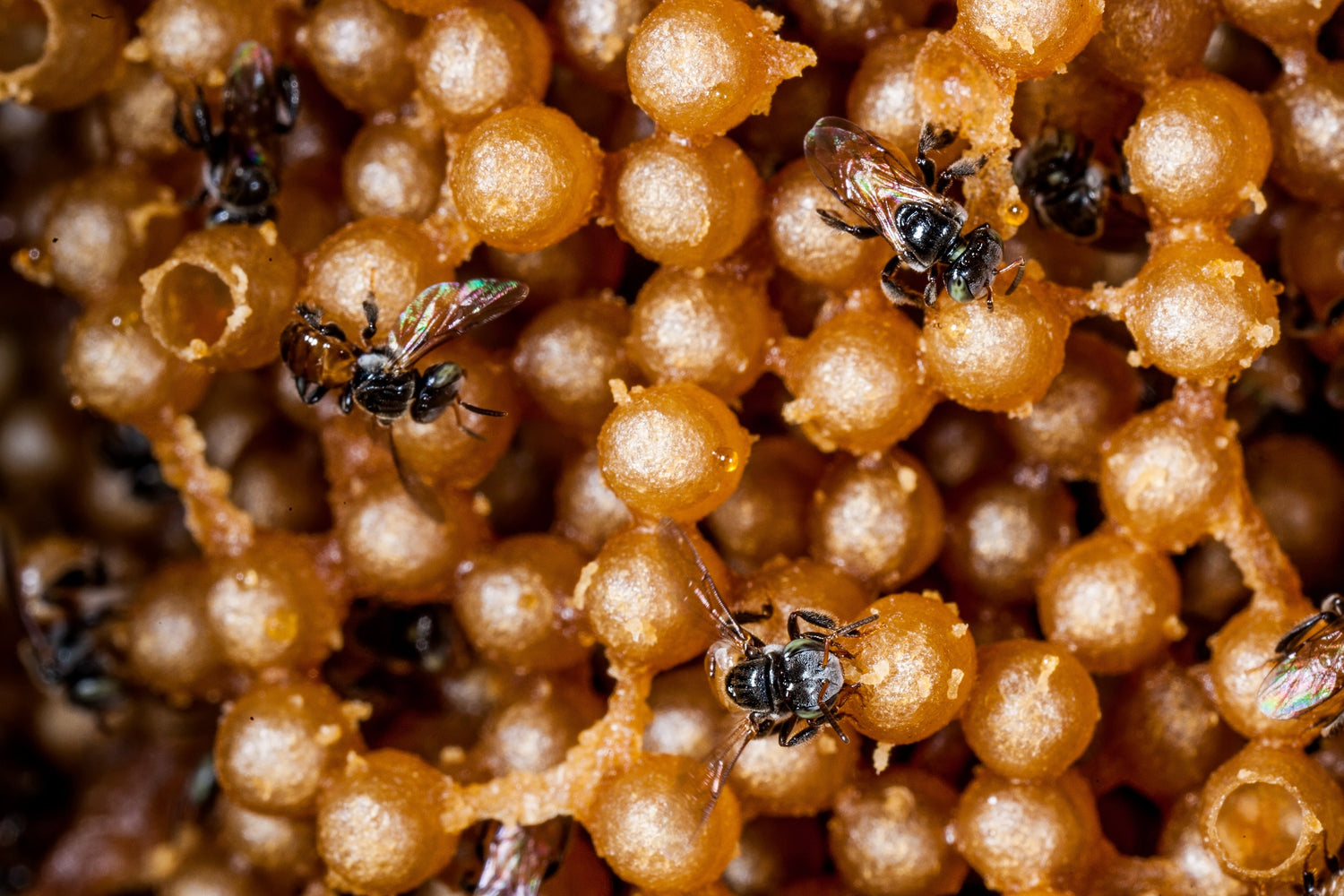 ハリナシバチは、外敵から身を守るため木や岩の間に巣を作ります。よく知られている六角形のハニカム構造ではなく、「ハニーポット(ポーレンポット)」と呼ばれる樹脂由来のプロポリスでできていて、茶色く丸いつぼのようなものが無数につながった複雑なつくりとなっています。
